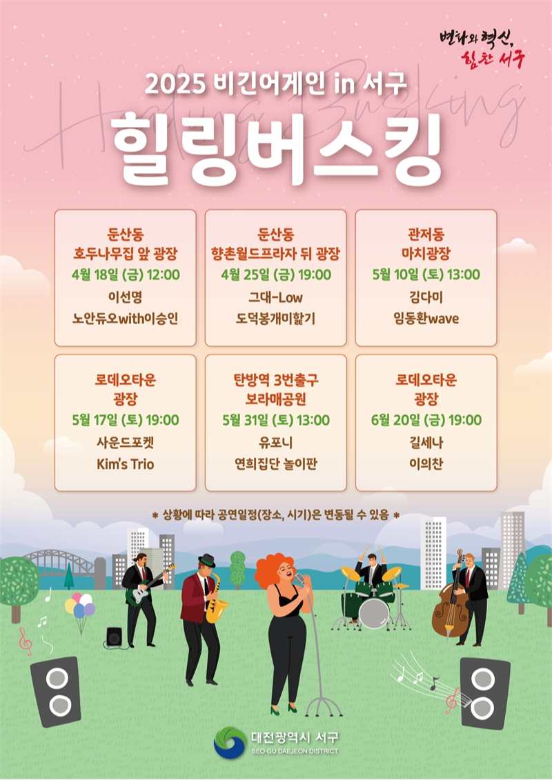 대전 서구는 지역 청년 음악인을 발굴·지원하는 2025년 상반기 ‘비긴어게인 in 서구 힐링 버스킹’ 공연을 이달 18일부터 6월 20일까지 총 7회 개최한다고 밝혔다.