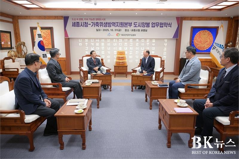 세종특별자치시(시장 최민호)가 31일 시청 세종실에서 도심 속 꿀벌 생태계 복원을 위해 가축위생방역지원본부와 ‘도시양봉 활성화 및 환경·사회·지배구조(ESG) 공동협력 업무협약’을 체결했다.