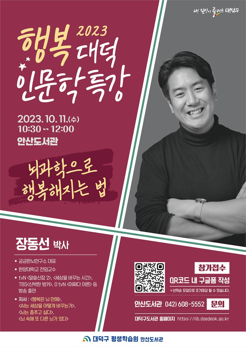 13일 대덕구에 따르면 ‘행복 대덕 인문학 특강’은 대덕구민들의 행복 추구 및 증진을 위해 마련된 것으로, 지난 7월 김상욱 교수 특강에 이어 오는 10월 11일 뇌과학자 장동선 박사(한양대학교 교수)를 초청해 뇌와 인간의 행복에 대한 강연을 진행한다.
