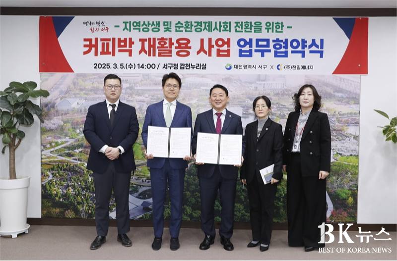 대전 서구는 이달 5일 신재생에너지 기업 (주)천일에너지와 커피박 재활용 사업을 위한 업무협약을 체결했다고 밝혔다.